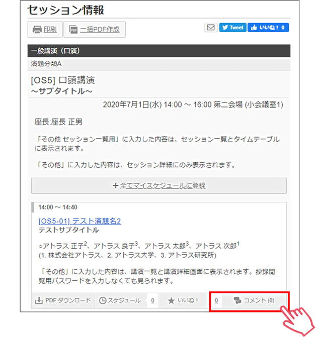 セッション中の質疑応答は時間が限られてますので、質疑がある場合は「セッション情報」より各演者の「コメント欄」を利用して演者の方との質疑応答を行ってください。 可能な範囲で随時、演者・参加者間での活発な質疑応答を行ってください。