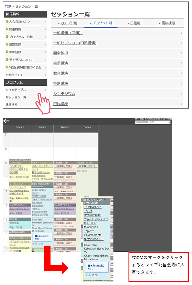下記の「オンライン開催会場はこちらから」ご移動ください。Web視聴および原稿PDFダウンロードのパスワードは、メールに記載されております。